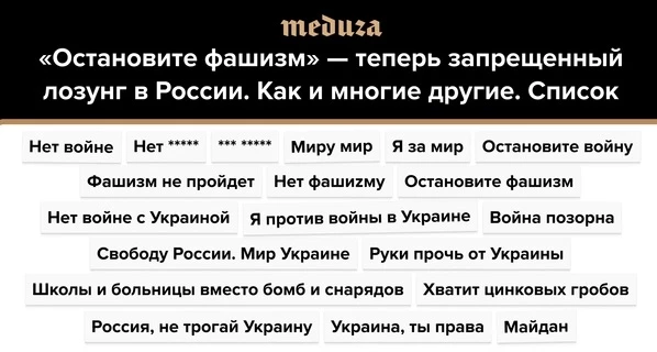 Список антивоенных лозунгов, которые фактически оказались под запретом в России. Людей, которые выходят на пикеты с плакатами за мир, задерживают и судят по статьям о «дискредитации» российской армии или о нарушении правил проведения митингов. По данным «ОВД-Инфо», с 24 февраля, когда началось вторжение в Украину, на антивоенных акциях по всей России задержали более 15 тысяч человек.