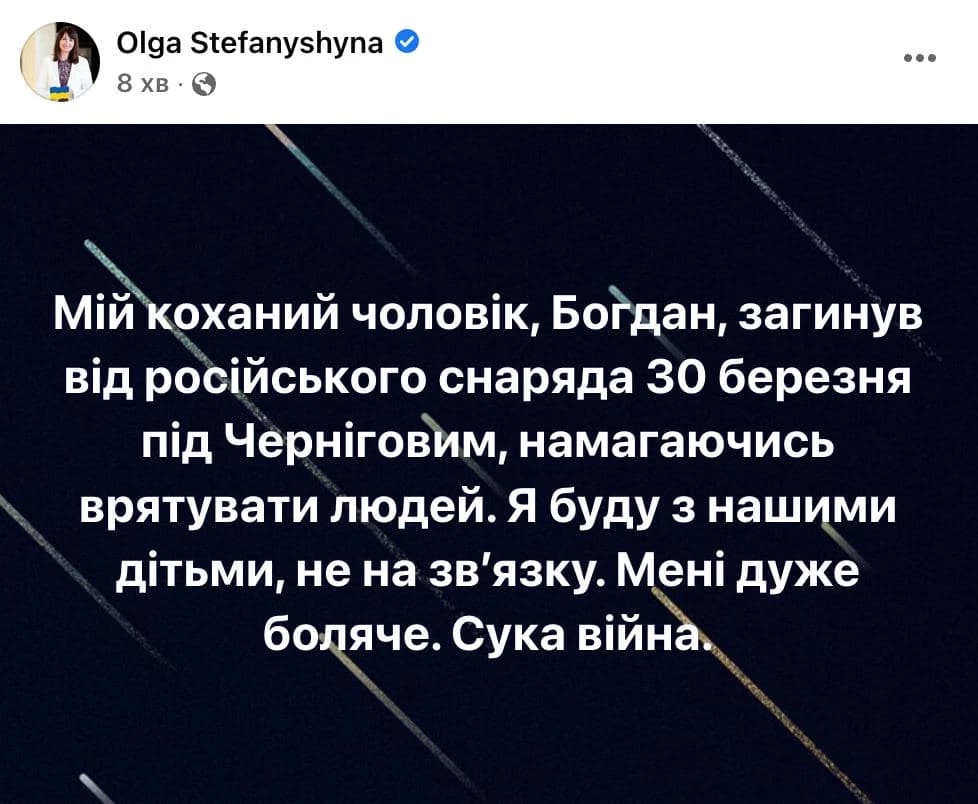 У вице-премьера Украины Ольги Стефанишиной погиб муж под Черниговом, сообщает УНИАН.