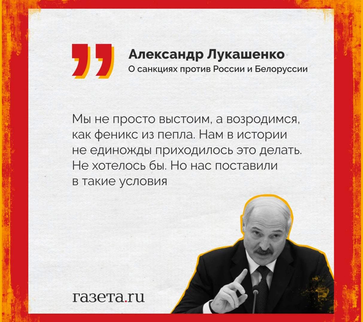 «Так, секундочку! Аляксандр Рыгоравіч, вы намекаете на то, что в условиях санкций наши страны уже обратились в пепел? Уже?», -- комментирует свежее заявление правителя Беларуси ЪЪ.