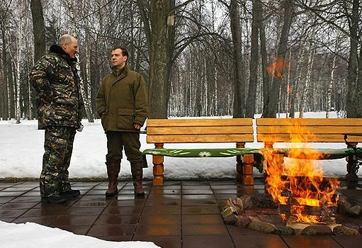 Когда в Завидове стало смеркаться, на асфальтовой дорожке появились президенты Медведев и Лукашенко. Оба сменили костюмы на охотничью униформу защитного цвета и не спеша прогуливались. Им еще предстояло барбекю.