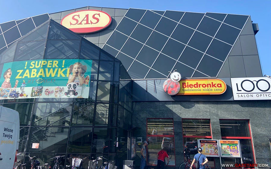 На окраине города — торговый центр «SAS». В три часа дня возле него не встретила ни одной машины с белорусскими номерами. Здесь располагаются продуктовые магазины, в том числе мясная лавка — за килограмм салями просят 40-50 злотых (20-26 бел. руб.), за килограмм бекона — 21 злотый (11 руб.), куриного филе — 28 злотых (14.67).