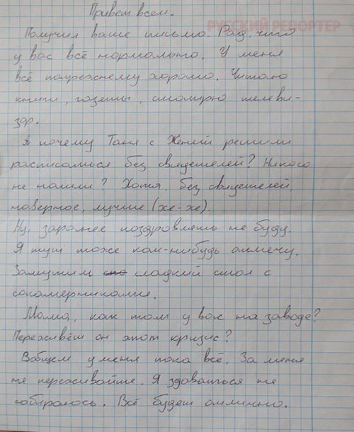 – Первое письмо пришло 23 апреля, – рассказывает «РР» Любовь Ковалева. – У меня такое впечатление, что ему сказали, как написать. Не его словами. Потом были письма в мае. Когда были активные следственные действия, писем не было. Пишет, что всё у него хорошо, что ест хорошо, что на прогулку их там выводят на пару часов. Еще в самом начале, он написал: «Мама, не верь тому, что говорят. Сдаваться не собираюсь. Буду держаться до конца»