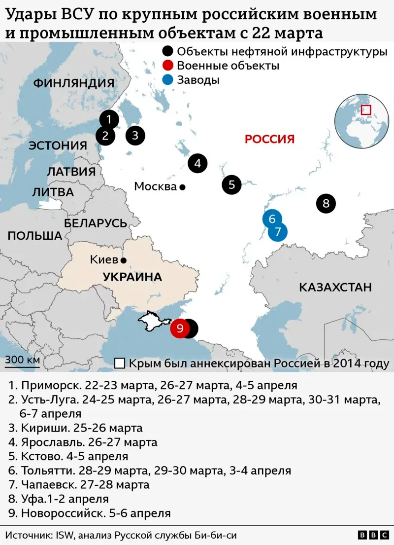 Как видно по карте, переложить ответственность на третьи страны за неудачи российской ПВО в центральных регионах, на Кубани и в Приволжье будет проблематично. И это лишь крупные предприятия, атакованные с 22 марта. Сообщения о взрывах и пожарах в России и на оккупированных украинских территориях стали регулярными.