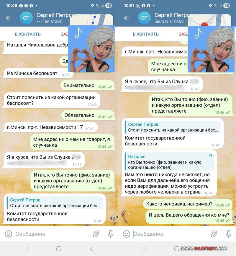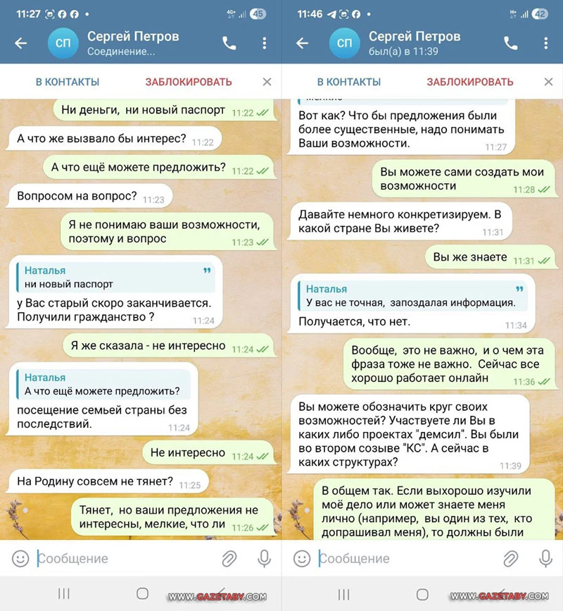 «Воспринимаю это как угрозу», — написала Наталья. «Отнюдь. Лишь способ верификации. Не в наших интересах вести разговор с позиции запугивания», — заявил собеседник.
