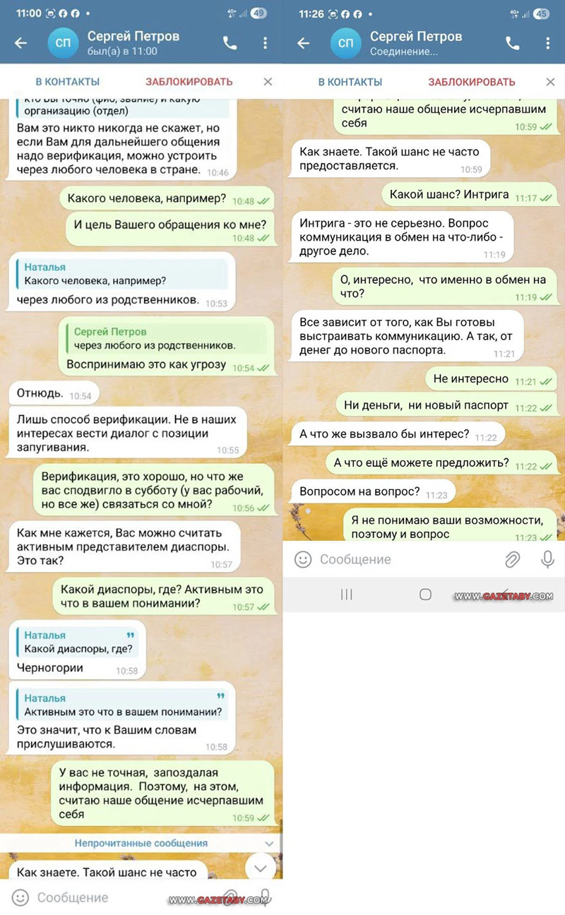 Говоря о цели обращения, он пояснил, что, по его мнению, Наталья является активным представителем диаспоры беларусов Черногории. Наталья заметила, что у него неточная информация, и сказала, что общение с ним себя исчерпало.