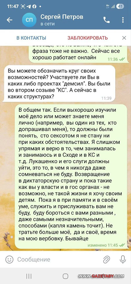 В субботу, 12 июля, Наталье в телеграме написал человек под ником @gfst1297, подписанный как Сергей Петров. Он пояснил, что представляет организацию, которая находится в Минске, на проспекте Независимости, 17.