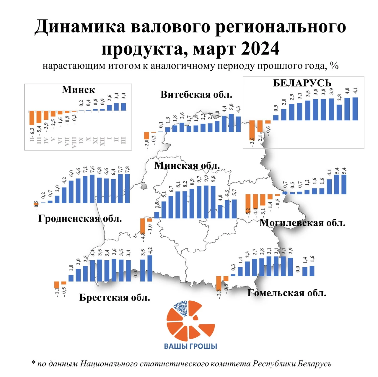 В первом квартале рост экономики показали все беларусские регионы. Быстрее всего он происходил в Гродненской области (+7,8% к первому кварталу 2023 года).