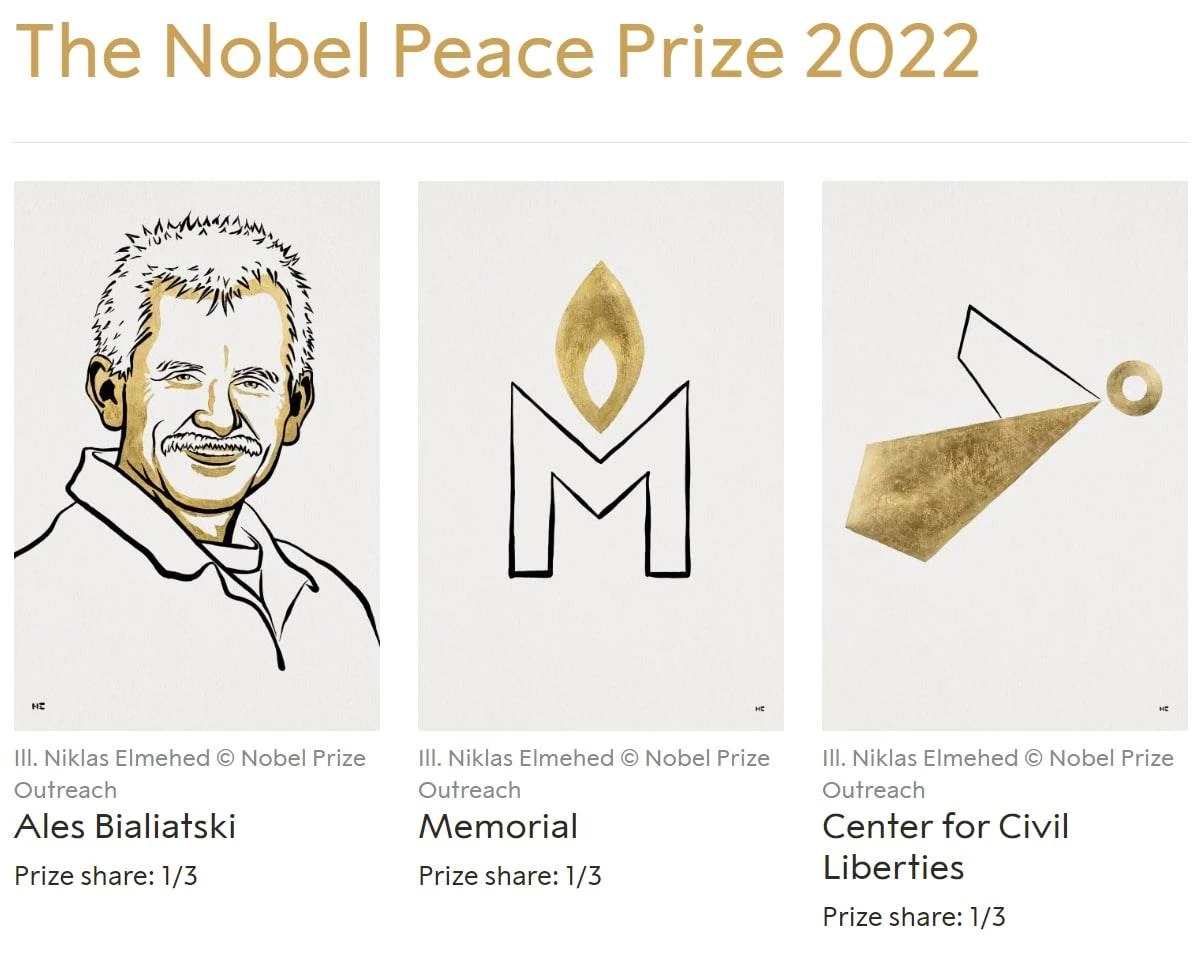Высокую награду — Нобелевскую премию мира 2022 — поделили белорусский политзаключенный правозащитник Алесь Беляцкий, российский «Мемориал» и украинский Центр за гражданские права.