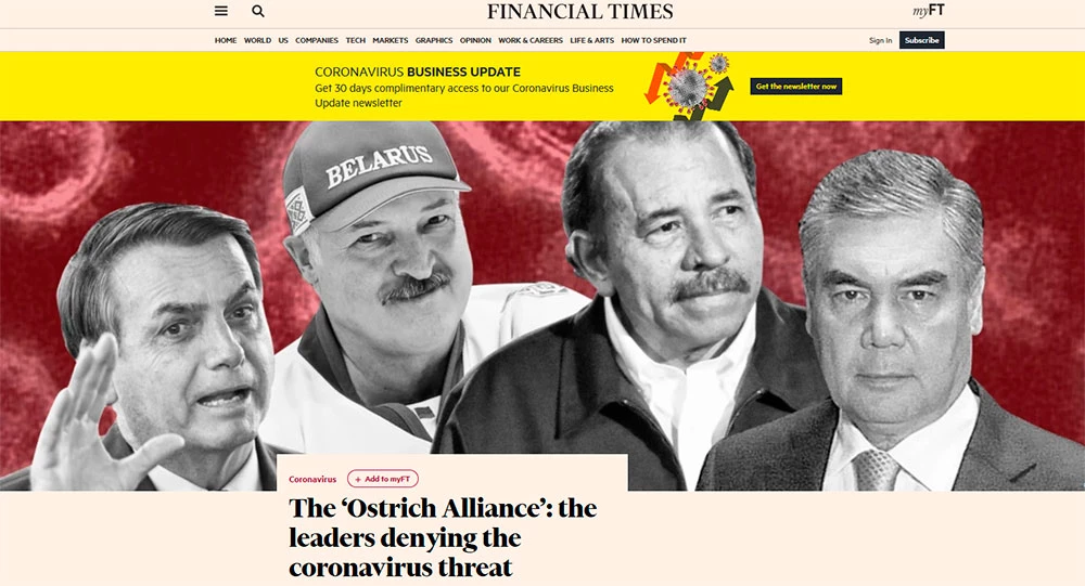 В апреле Financial Times опубликовала статью о политических лидерах, игнорирующих опасность коронавируса. В так называемый «страусиный альянс» издание включило Жаира Болсонару, Александра Лукашенко, Даниэля Ортегу и Гурбангулы Бердымухамедова.