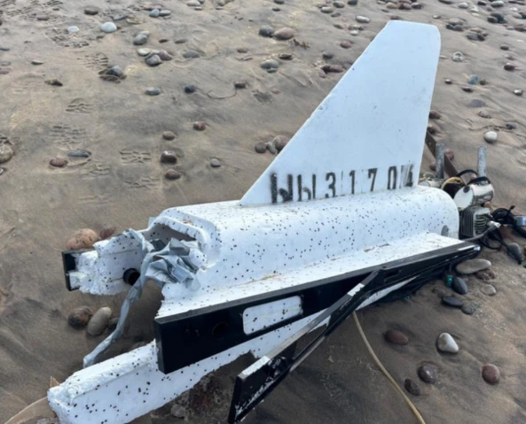 Обломок хвостовой части дрона-приманки Гербера с номером ЫЫ31704, найденный на пляже в Латвии