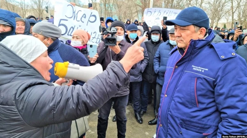 Протестующая высказывает свои недовольства акиму Мангистауской области Нурлану Ногаеву