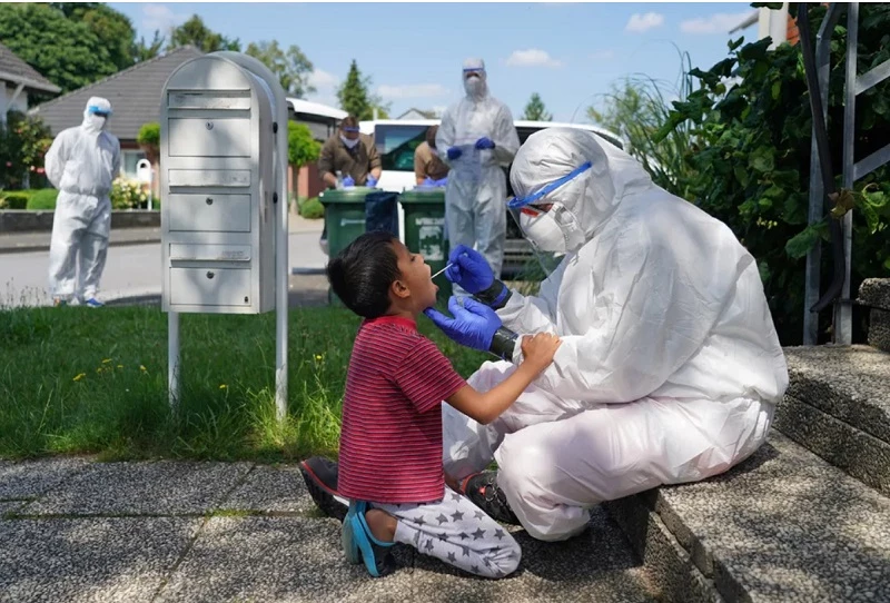 Сотрудник «Красного креста» берет мазок у шестилетнего ребенка. Гютерсло, Северный Рейн-Вестфалия, 23 июня. Фото Getty Images