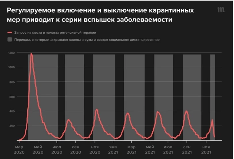 Одна из самых известных работ, где был предсказан значительный рост заболевших, — доклад группы Нила Фергюсона из Имперского колледжа в Лондоне о последствиях неконтролируемого распространения инфекции в Великобритании. «Медуза» подробно писала об этой работе, в том числе о сценарии введения в будущем периодического «включения» и «выключения» ограничительных мер, которые ведут, по заключению британских исследователей, к возникновению второй, третьей, четвертой и других волн заболеваемости.