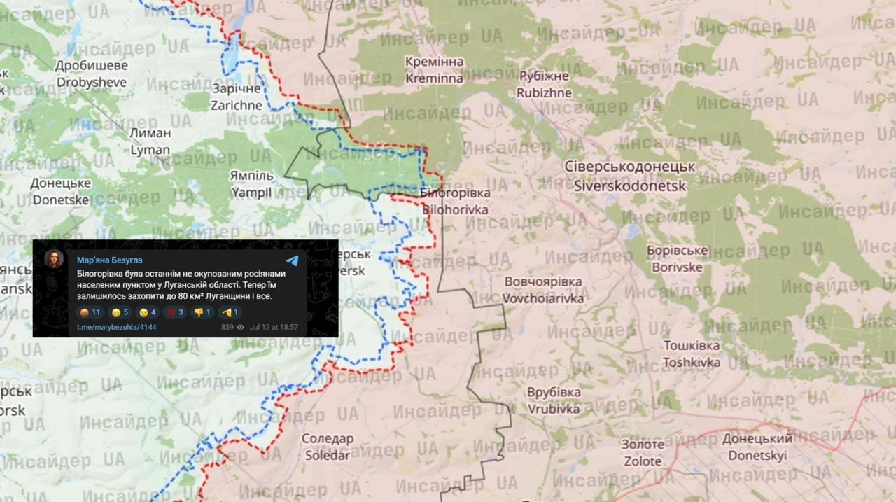 РФ контролирует почти всю территорию Луганской области — для полной оккупации осталось менее 80 км², — нардеп Безуглая (цитируется по Инсайдер UA).