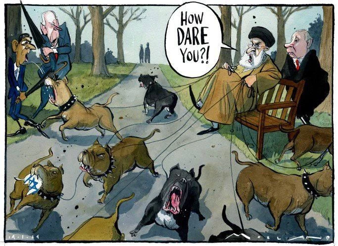 Россия и Иран с цепными собаками — на карикатуре от The Times.