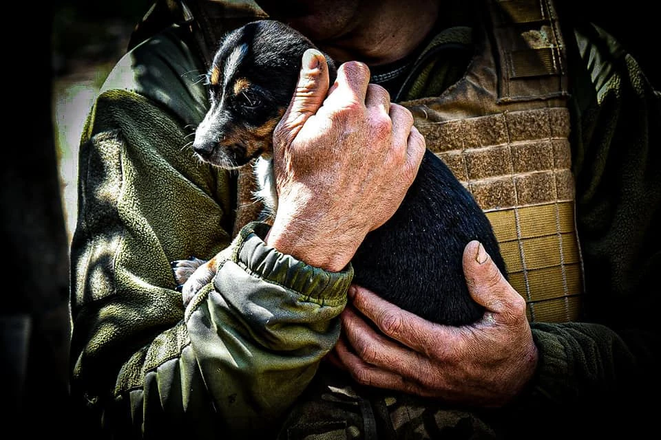 Бойцы 30-й бригады на передовых позициях с четырехлапыми собратьями.