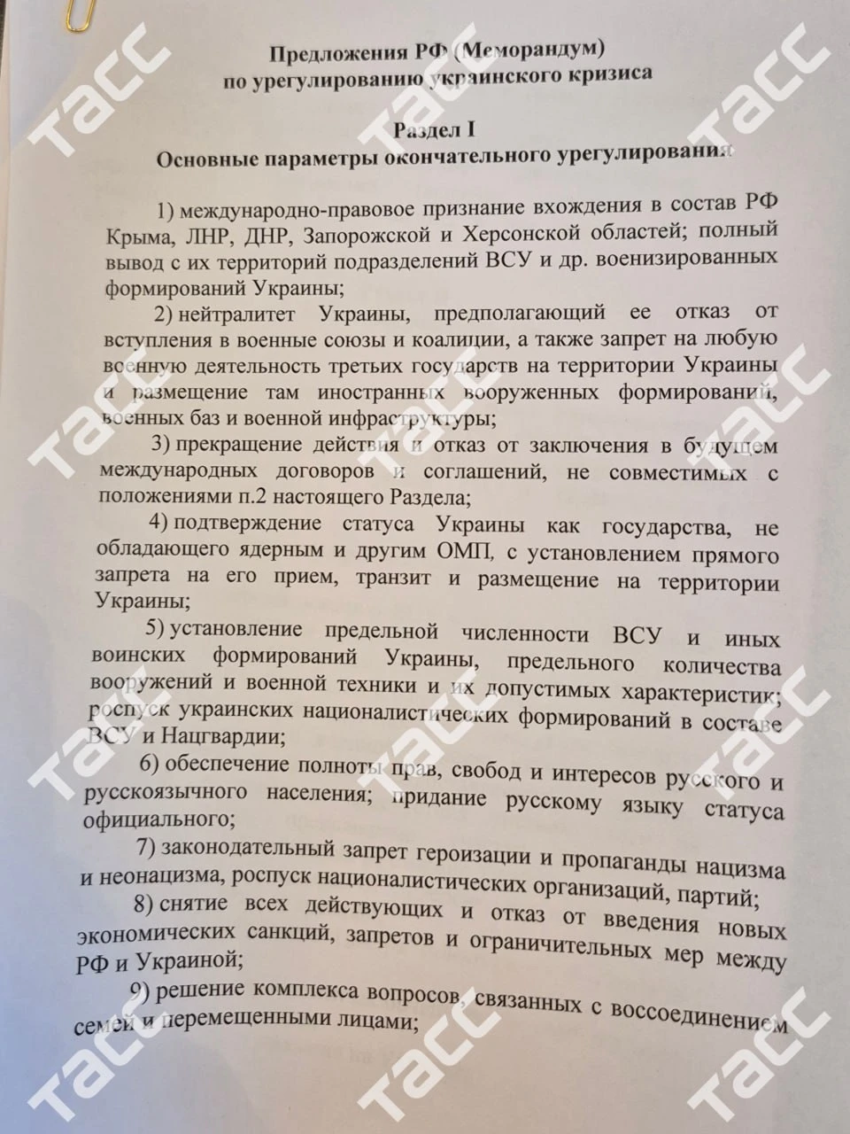 Опубликован текст меморандума, который российская делегация передала украинской на переговорах в Стамбуле.