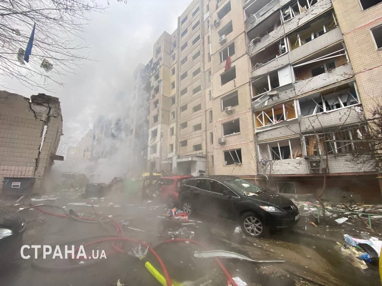 Последствия прилета в жилой дом в Соломенскиом районе Киева. Разрушены многие балконы, выбиты все окна, около 20 пострадавших.