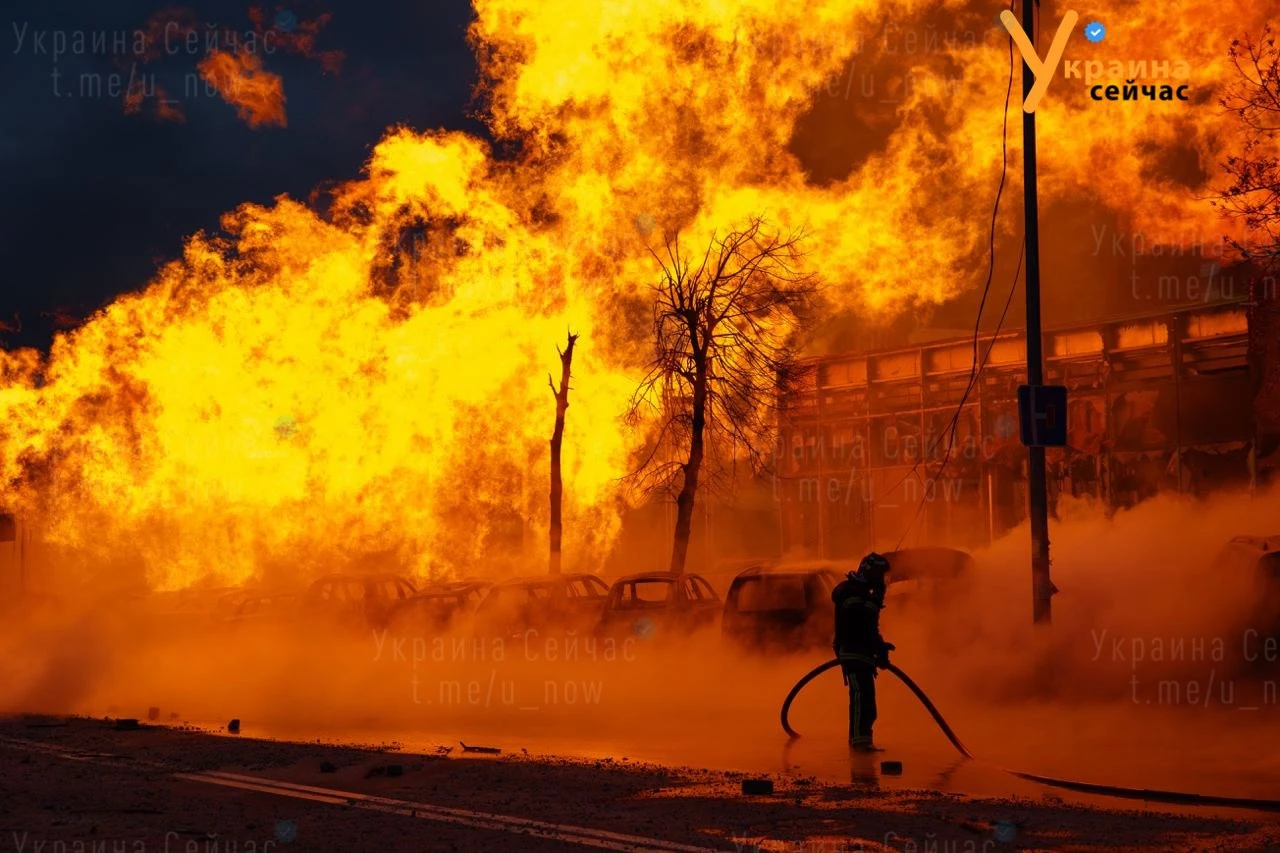 В результате ракетного обстрела Киева в Подольском районе города произошел пожар в автосалоне. Полностью сгорели 29 автомобилей, сообщает МВД Украины.