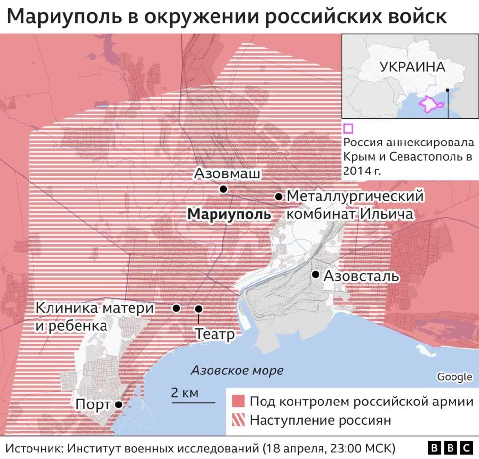 В Мариуполе остаются около 130 тысяч жителей, город в осаде уже более 50 дней, сказал BBC заместитель мэра города Сергей Орлов. Все это время им не хватает еды, воды и медицинской помощи.