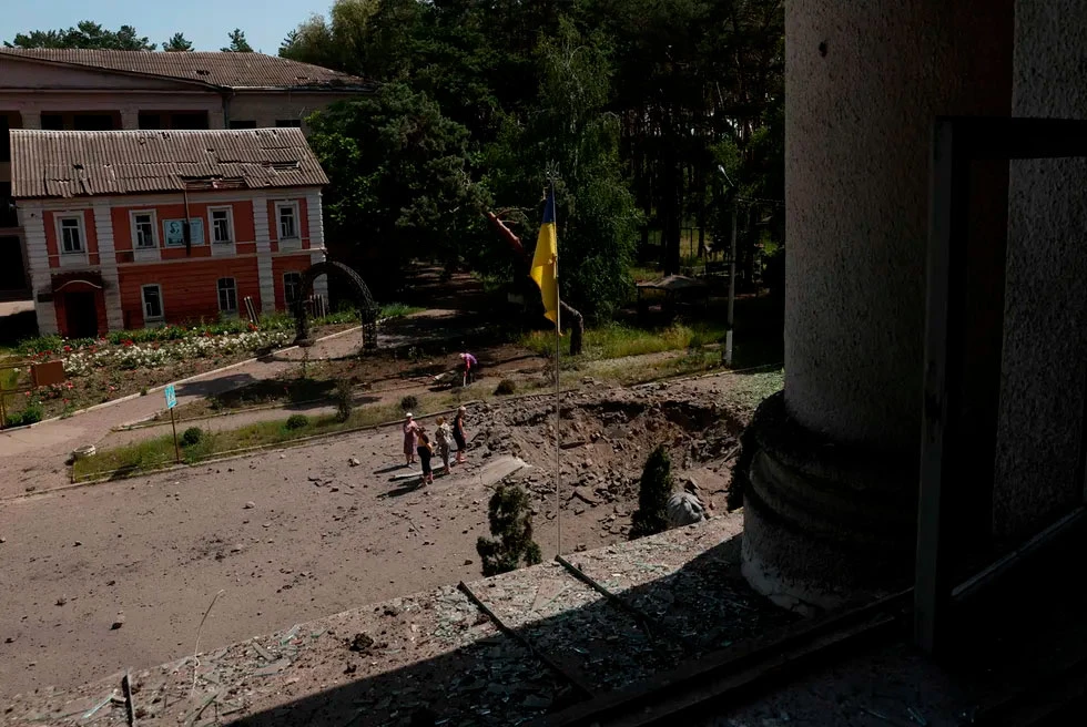 Фотофакт: жители поселка Малая Даниловка к северу от Харькова рассматривают воронку, появившуюся после ночного обстрела. Снимок сделан через выбитое окно поврежденного здания Харьковской государственной зооветеринарной академии.