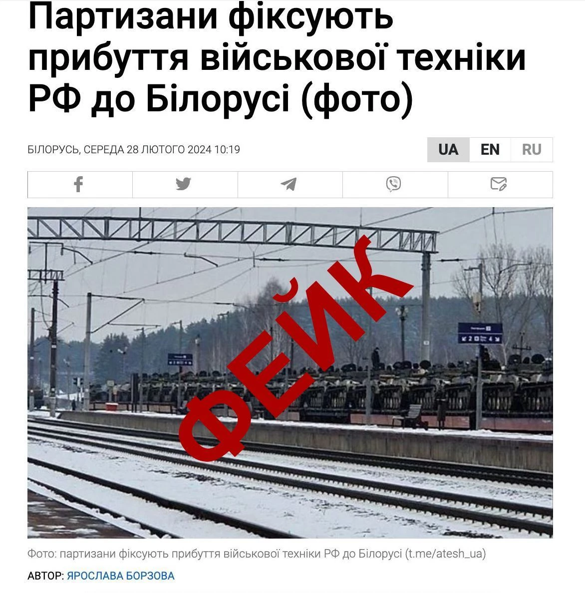 Украинские СМИ сообщают о прибытии в Беларусь эшелона с российской техникой. Это фейк, пишет Беларускі Гаюн.