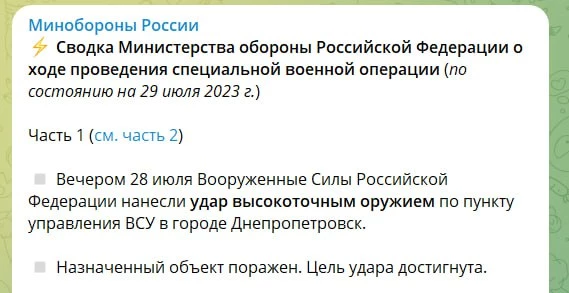 В Министерство обороны РФ назвала удар по многоэтажке в Днепропетровской области «поражением пункта управления ВСУ».