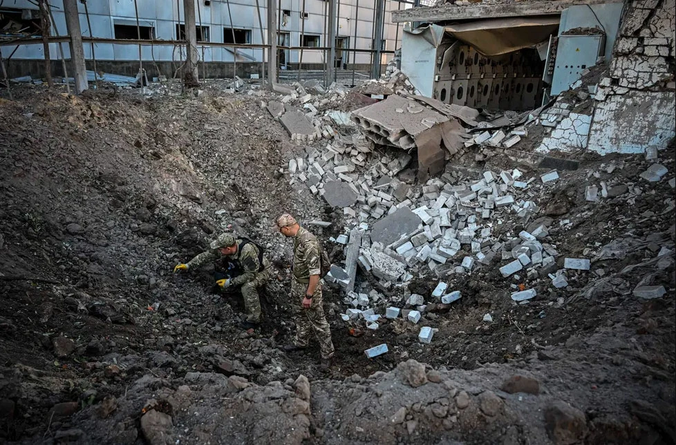 Фотофакт. Украинские военные осматривают воронку после ракетного удара в Харькове.