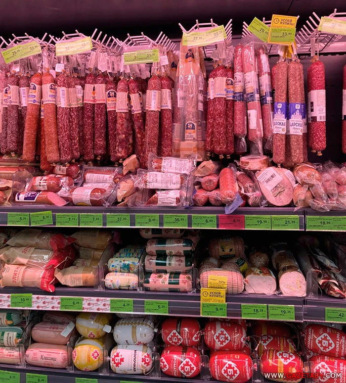 Колбасы остались примерно на том же уровне. А вот мясо в целом подорожало. Тушка курицы сейчас обойдется нам в 6,89 рублей (в прошлом году 6,59), а свинина самое меньшее в 19 рублей, хотя в прошлом году находили за 17.