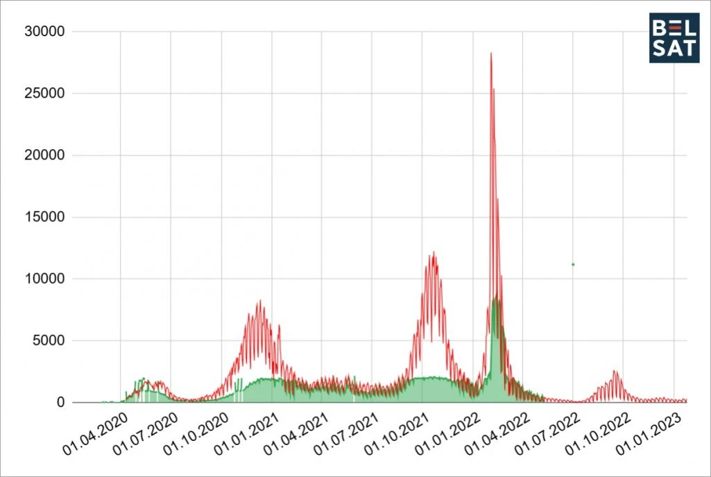 Статистика заболеваемости, полученная организацией BELPOL, существенно отличается от той, что публиковало Министерство здравоохранения. Не совпадает даже форма графиков заболеваемости: общее между официальной и реальной статистикой разве что одно – пик заболеваемости и там, и там пришелся на февраль 2022 года.
