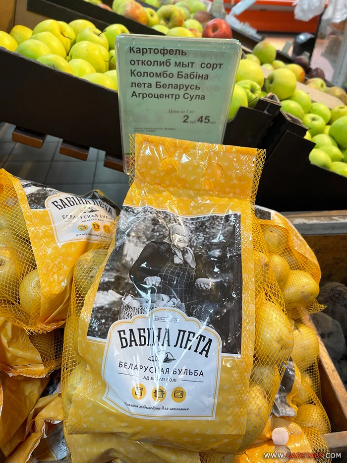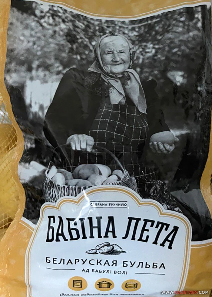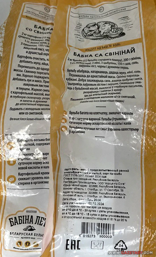 Вось як прыгожа аграцэнтр «Сула» спакаваў сабраную ўручную і мытую бульбу, якая ідэальна падыходзіць для запякання. На адваротным баку яшчэ і рэцэпт бабкі са свінінай на роднай мове.