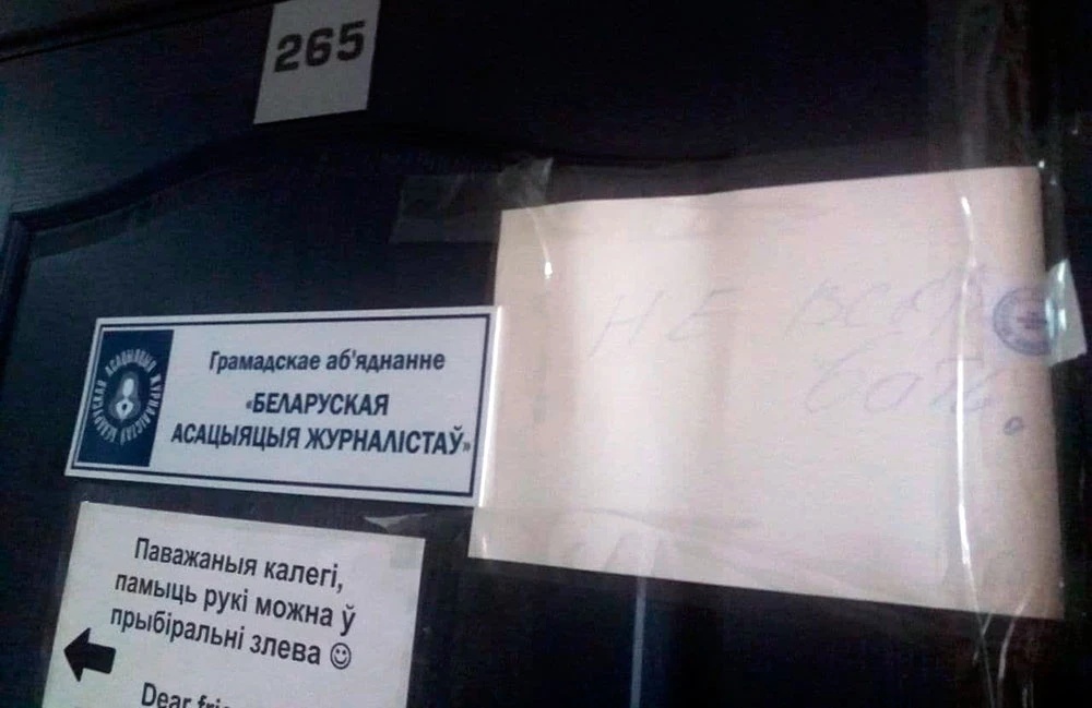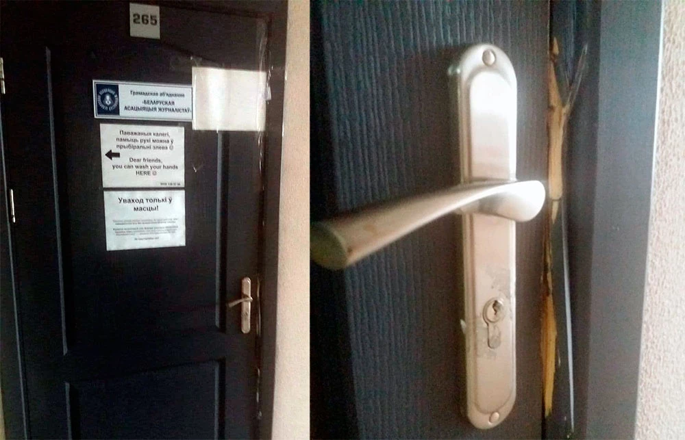 Так выглядят двери офиса Общественного объединения «Белорусская ассоциация журналистов» после визита силовиков. Фото БАЖ: