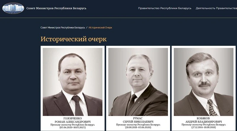 Портреты недавних глав правительств там размещены в стиле, похожем на траурный. Под фотографией Романа Головченко бросается в глаза дата – 10.03.2025, под фотографией Сергея Румаса – 03.06.2020.