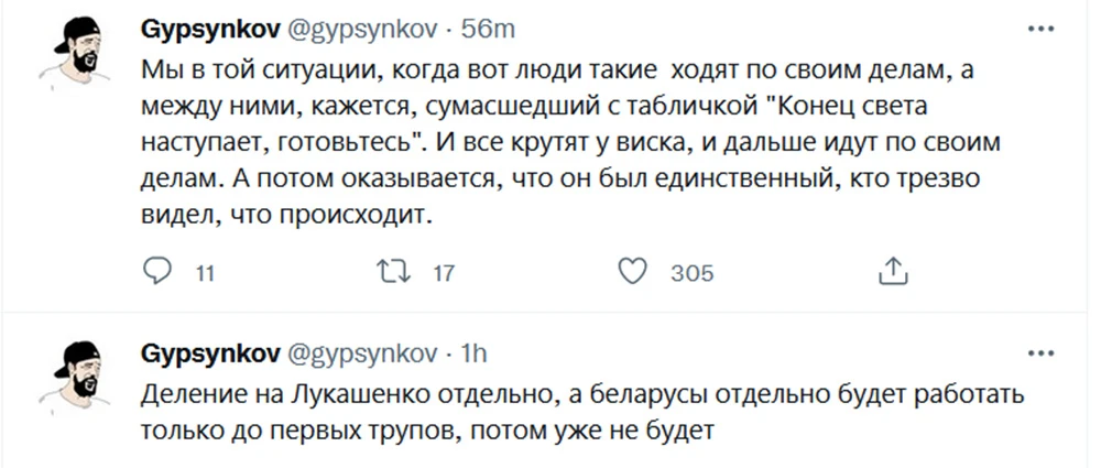 Северин Квятковский, журналист: «Гляджу, некаторыя беларусы, асабліва з замежжа, бяруць адказнасць на сябе, маўляў, не даціснулі Лукашэнку, і вось. Сорамна за беларускае войска і г.д.