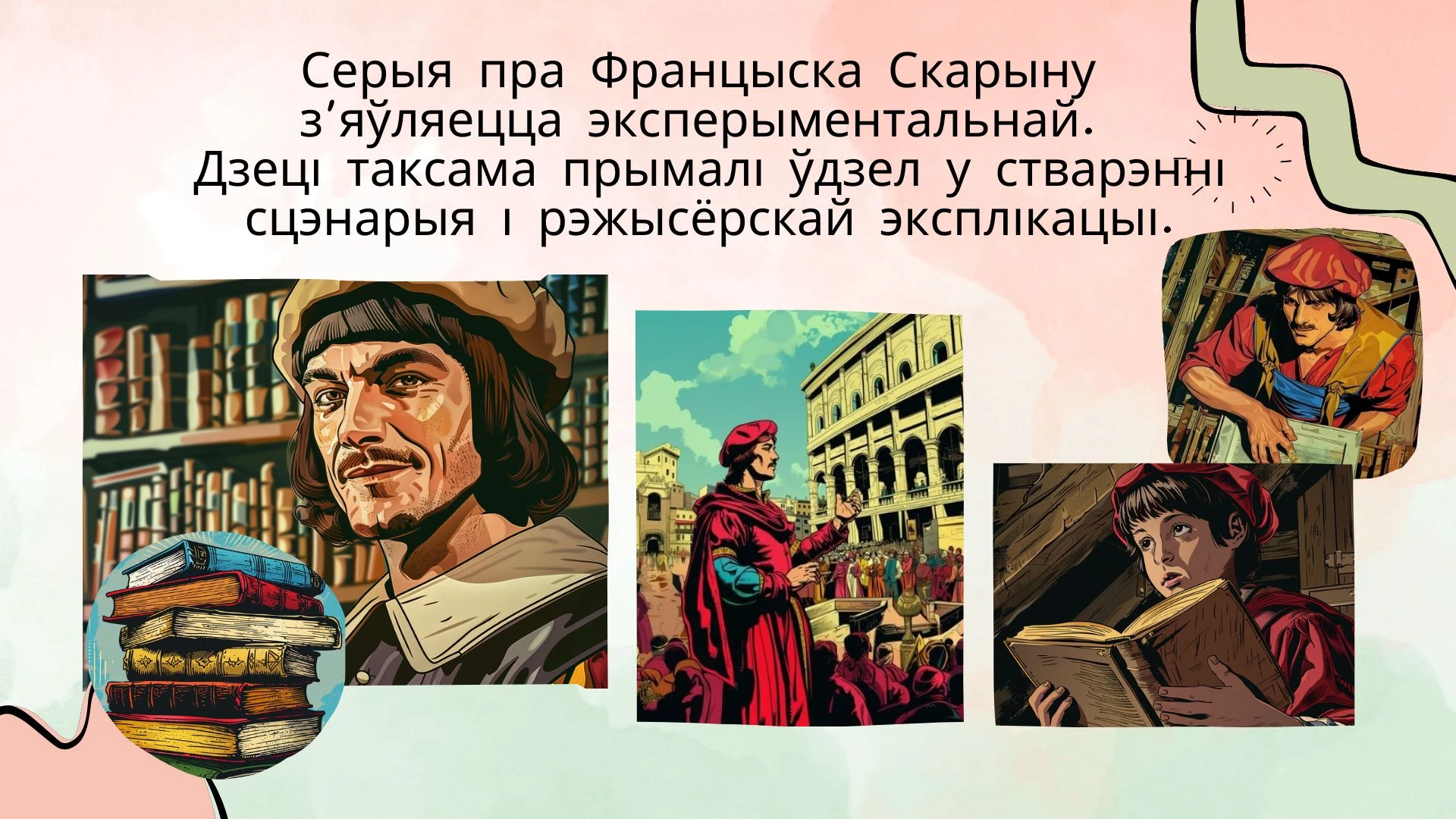 Серыя пра Францыска Скарыну была эксперыментальнай. Тут дзеці не толькі стваралі ілюстрацыі, але і актыўна ўдзельнічалі ў распрацоўцы сцэнарыя. У выніку ў гісторыі пра першадрукара апавядаецца, напрыклад: