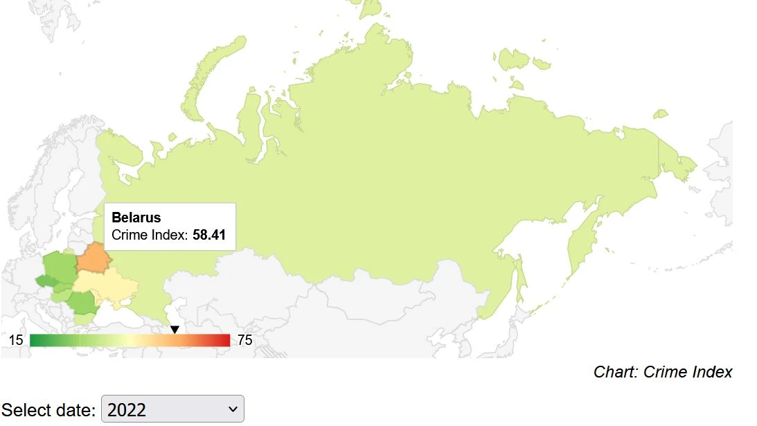 Беларусь занимает 116-ую строчку рейтинга: индекс безопасности в нашей стране, по оценкам специалистов, составляет всего 41,59, а индекс преступности — 58,41. По соседству с Беларусью в списке оказались, например, Колумбия, Сомали и Гватемала — они чуть выше в рейтинге, а обогнать удалось Зимбабве, Ливию и Северную Корею.