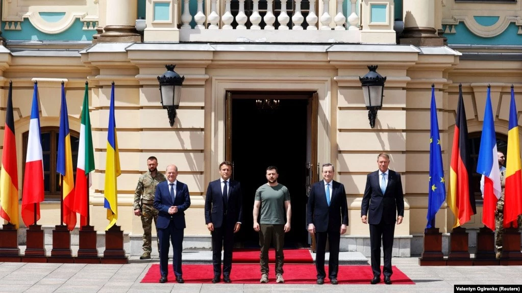 Макрон и Шольц, находящиеся с визитом в Киеве, заявили, что Франция, Германия, Италия и Румыния выступают «за» немедленное предоставление Украине статуса кандидата в члены ЕС.