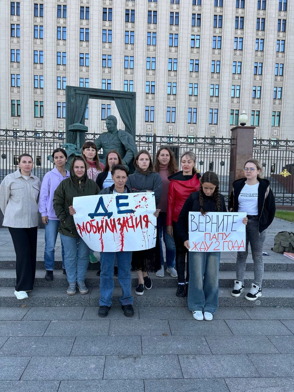 В Москве жены мобилизованных вышли с протестом к зданию Минобороны на Фрунзенской набережной, чтобы потребовать демобилизации своих мужей. По данным «ОВД-Инфо», на акцию к ее началу пришли около 20 человек.