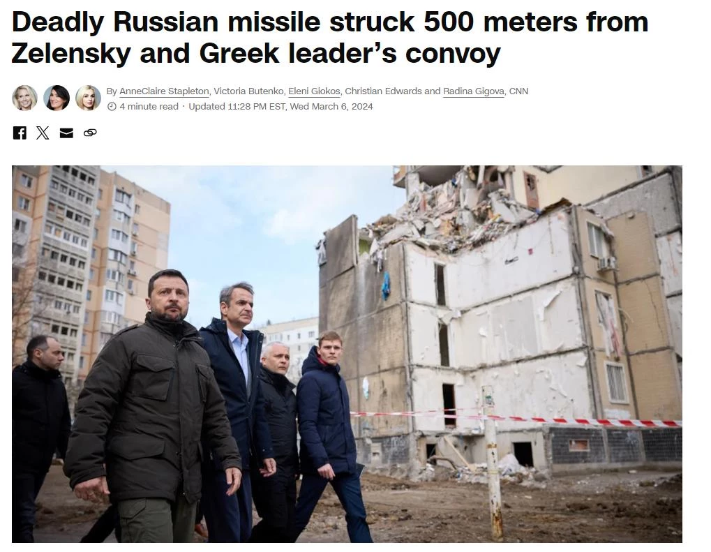 Ракета оккупантов ударила по Одессе в 500 метрах от Зеленского и премьера Греции Мицотакиса, пишет CNN. Колонна, которая везла лидеров с визитом в город, «ощутила на себе воздействие удара, и группа увидела грибовидное облако дыма».