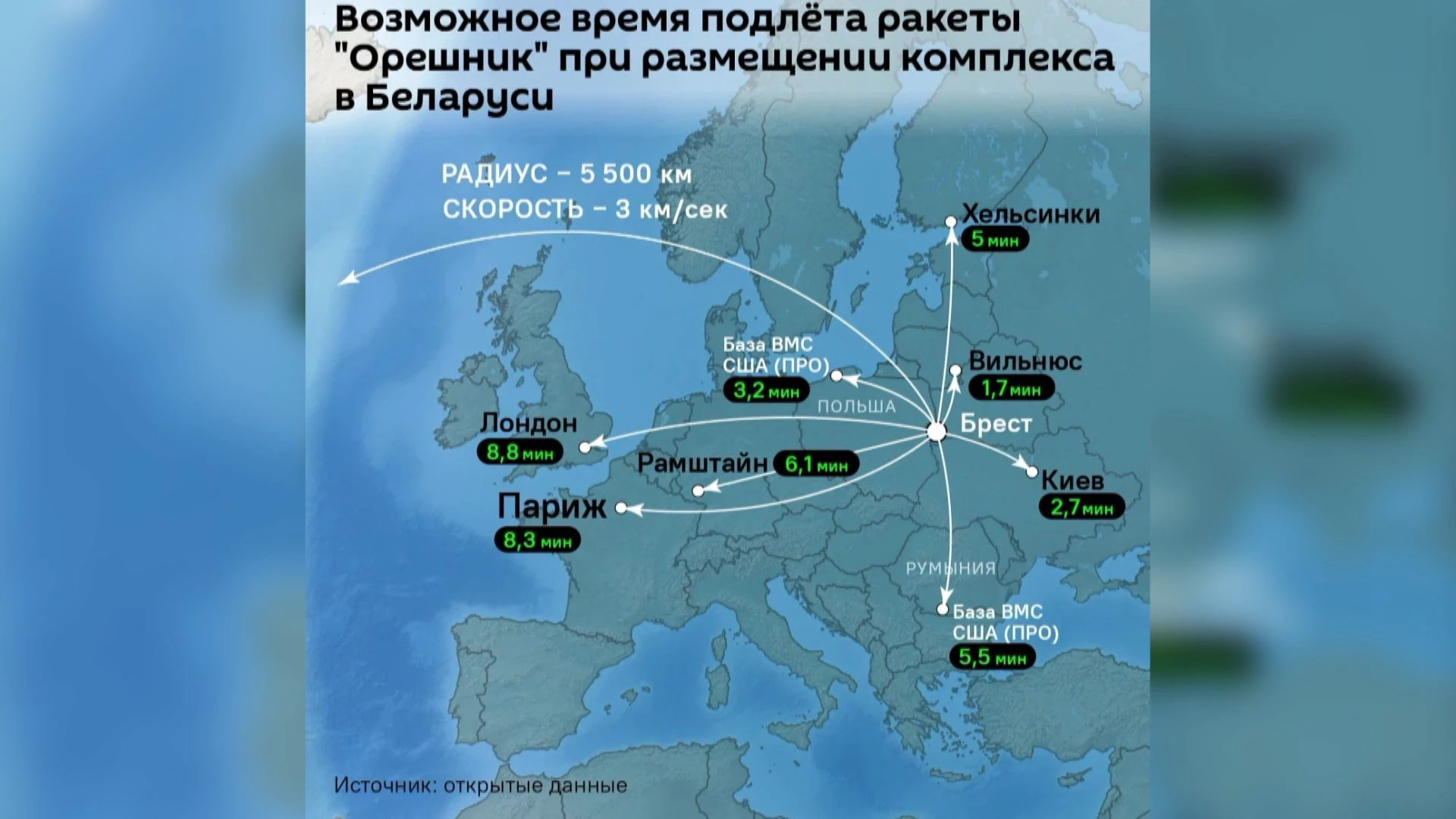 На гостелеканале «Беларусь 1» показали расчетное время подлета ракеты «Орешник», запущенной из Бреста по западным столицам и американским базам в Европе. В сюжете заявили, что это размещение российских ракет в Беларуси — «это превентивный ответ», пишет Зеркало.